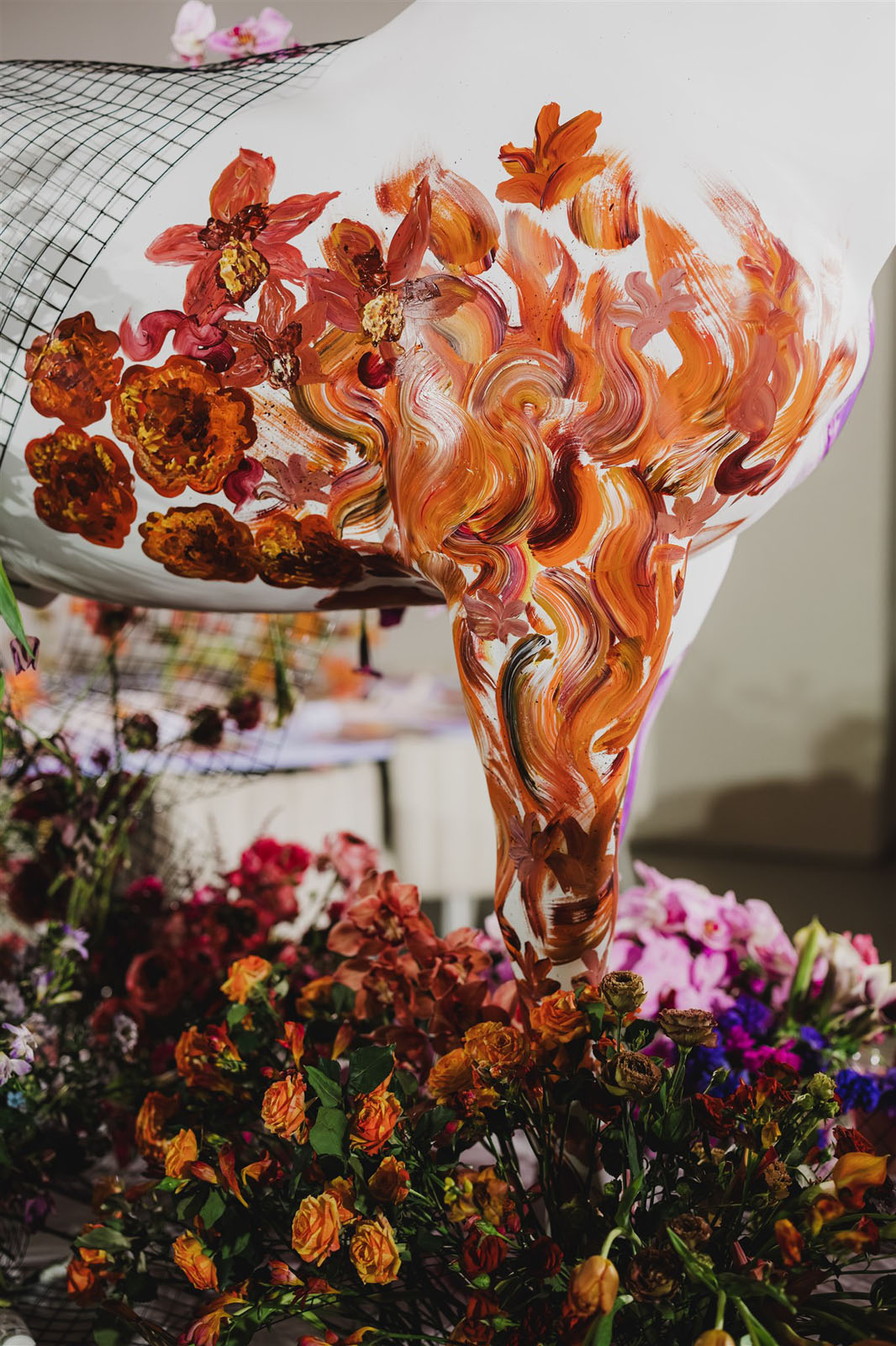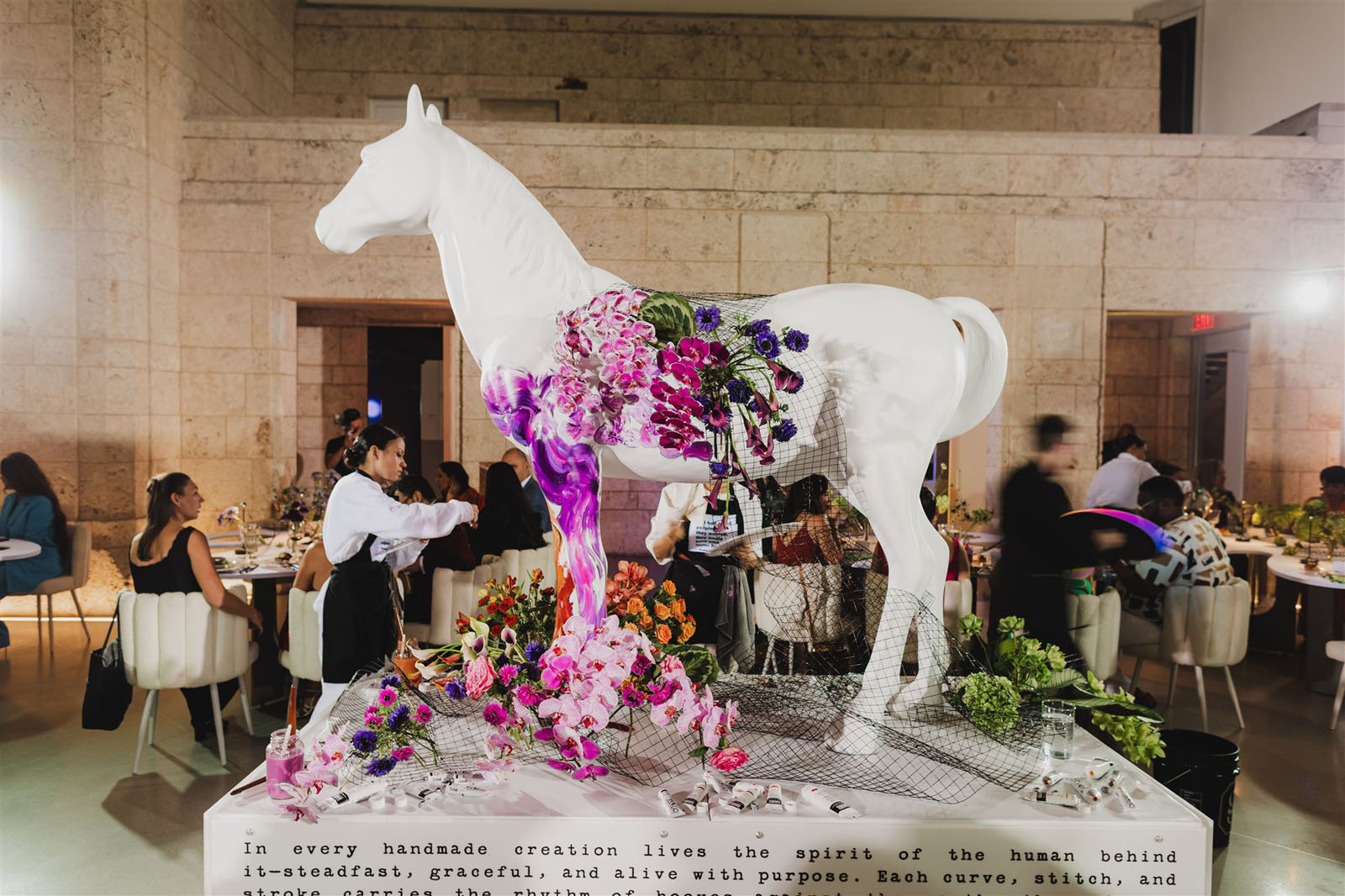 As dinner progressed, the space came alive with a performance of artistry in motion. A life-size horse, which began the evening as a pristine white canvas, was transformed in real time by a florist and two artists, who painted and adorned it with live florals in every hue of the spectrum.