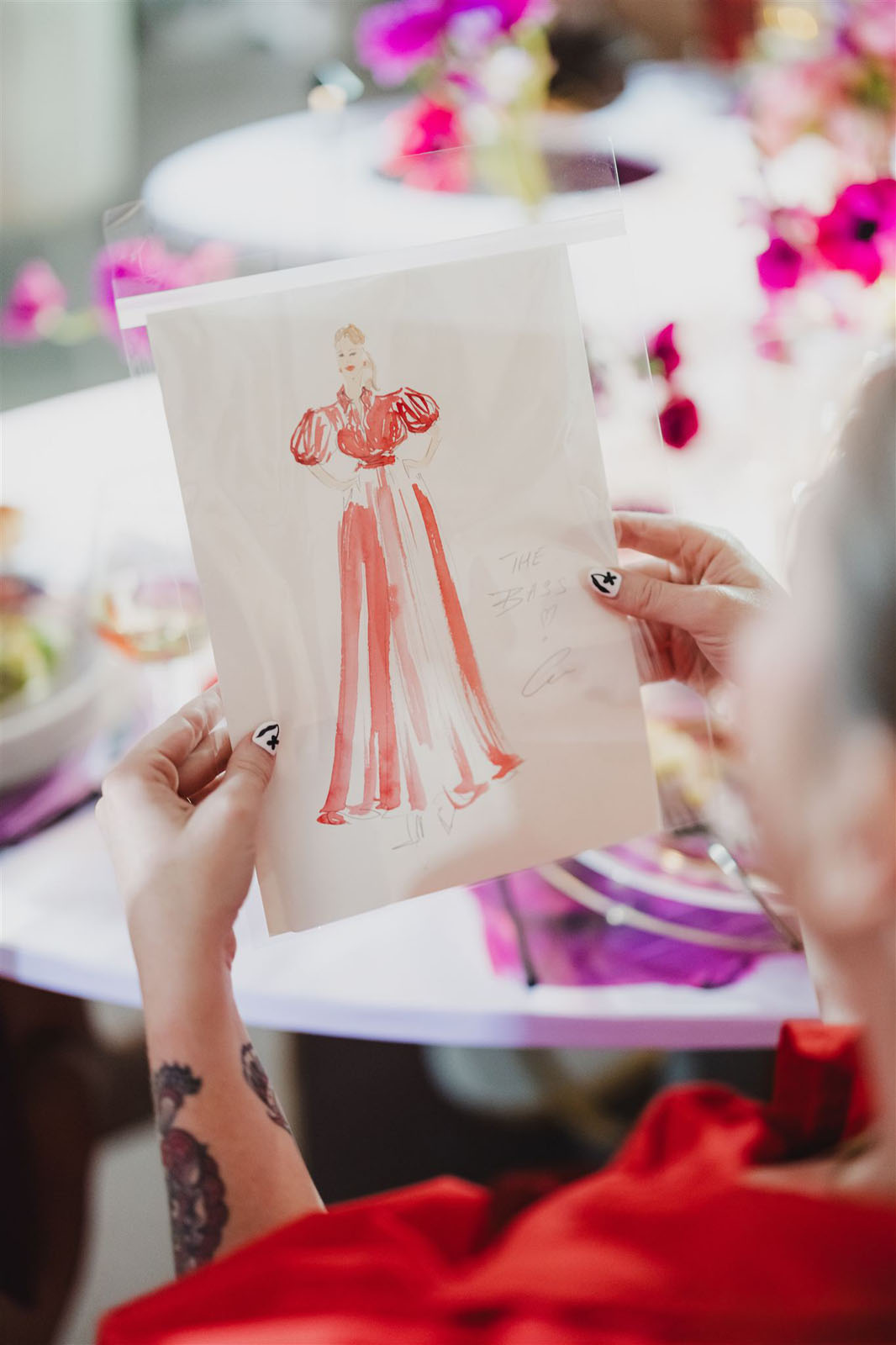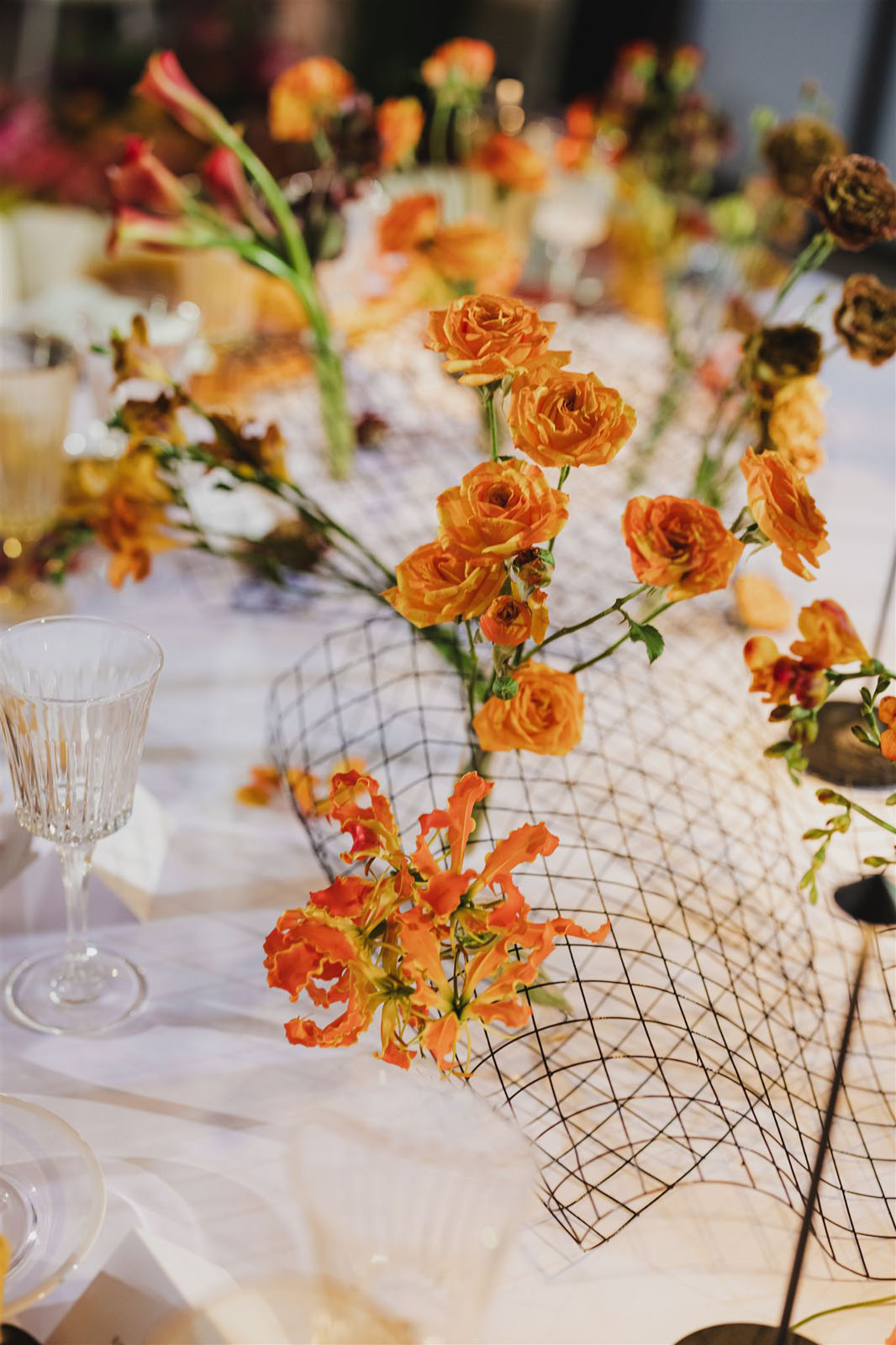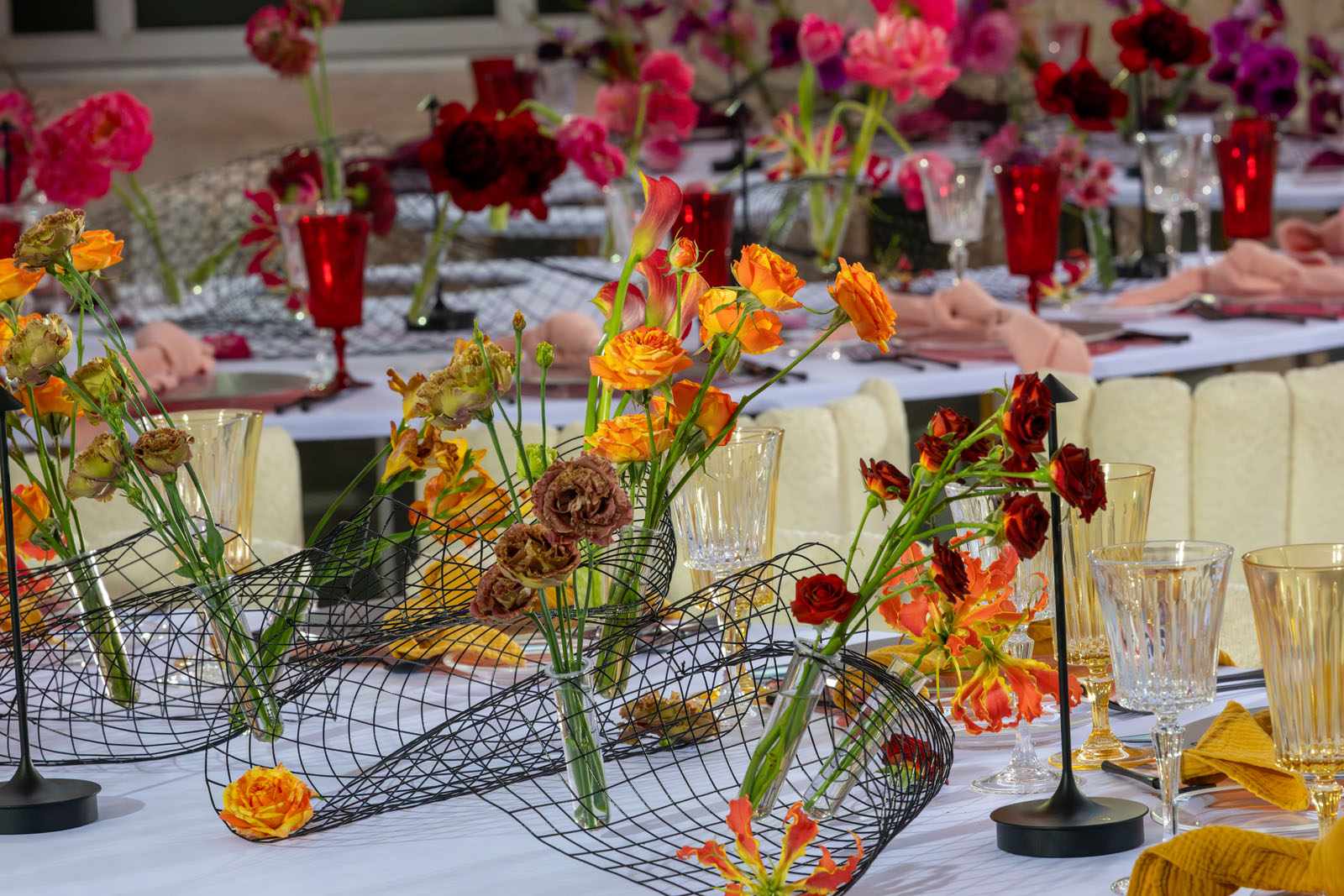 Matching florals appeared to float above the tables, woven through delicate metal mesh to create layers of depth and dimension, while curated tabletop rentals echoed the distinct color story of each setting.
