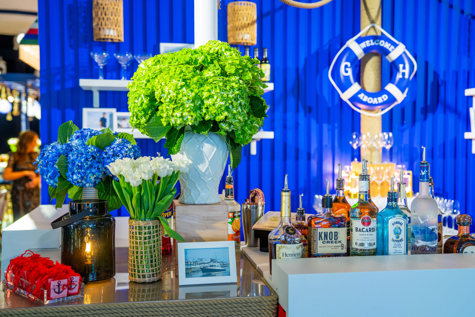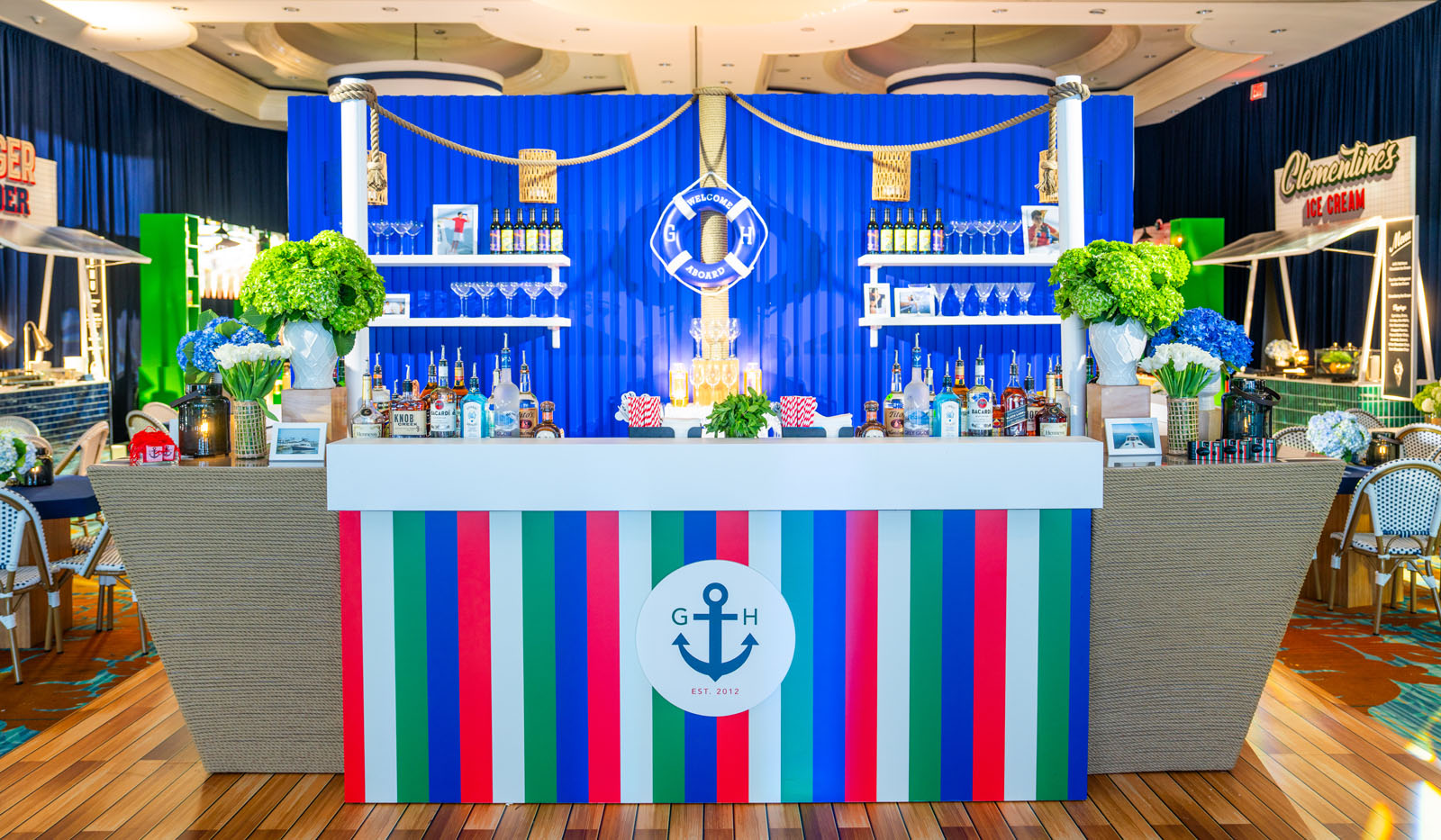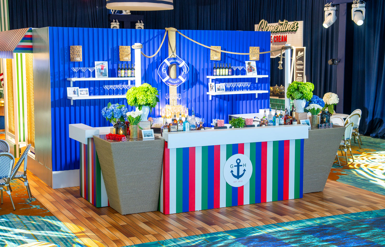 Captain’s Candy Shop made a grand debut later in the celebration, encircled by a rope-detailed bar positioned beside the dance floor to keep the energy high and the party flowing. Across the room, a custom sofa vignette sat against a postcard-style backdrop of the bay, evoking the feeling of a yacht gliding out of the marina at golden hour.