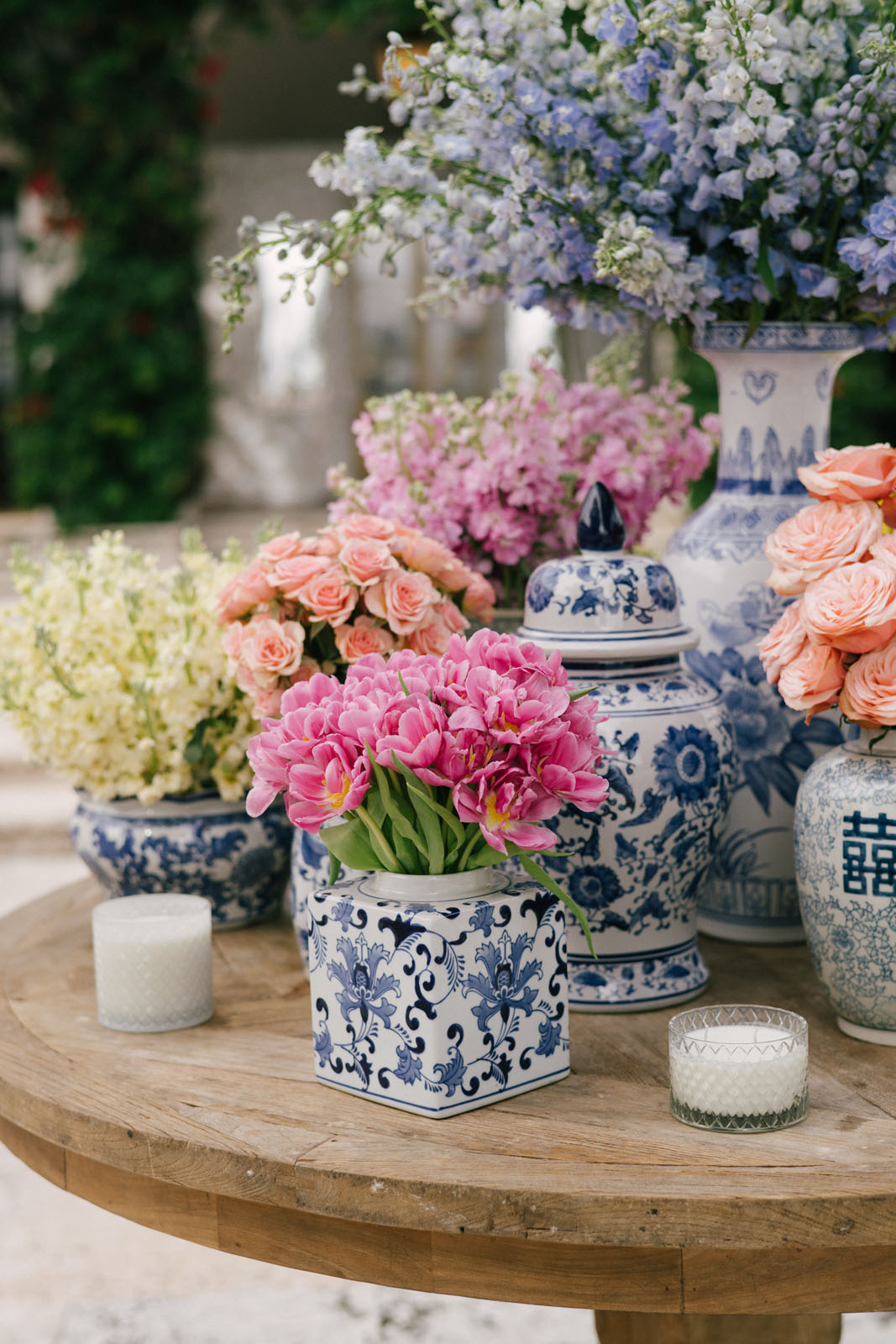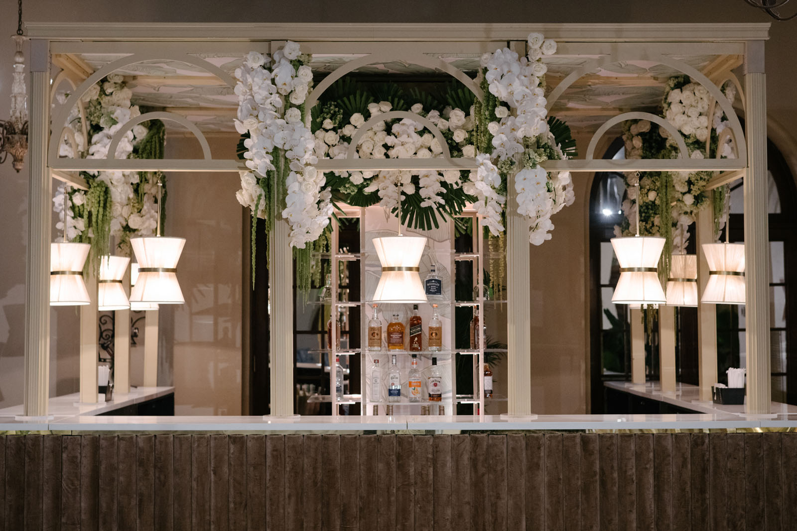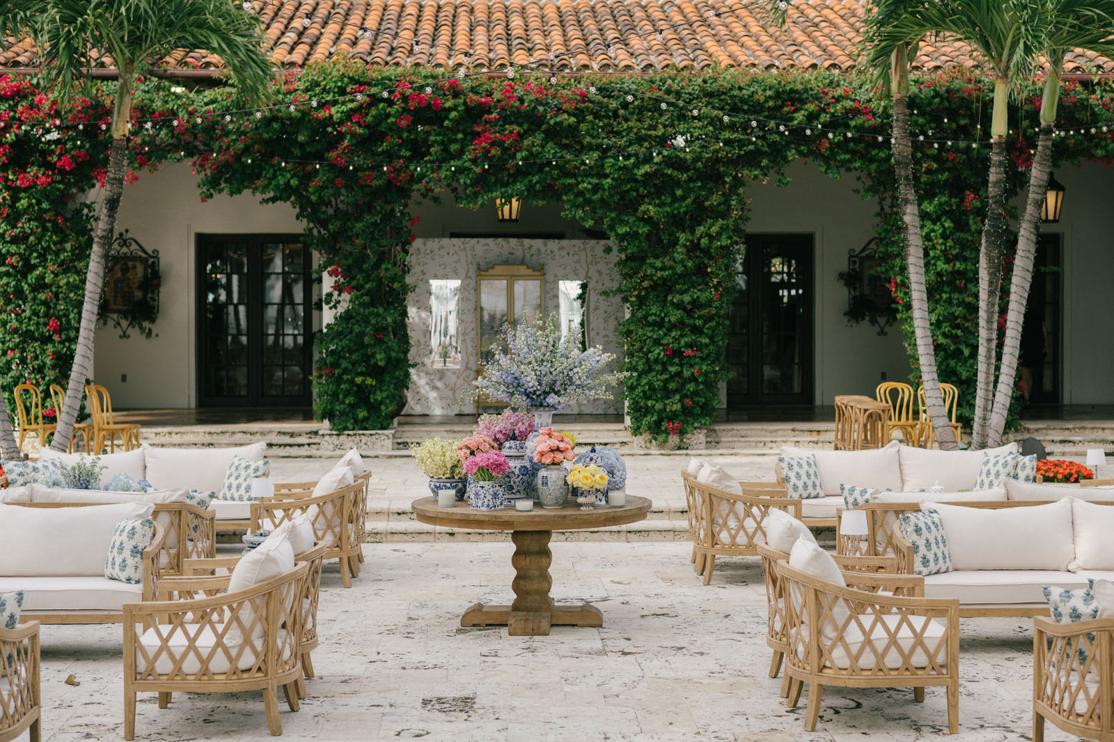 Our designer’s wedding structure of choice became a tailored translucent arch that we fabricated to perfectly frame the venue’s regal palms, the ocean views, and manicured grass field. For the cocktail experience, Chinoiserie—a style holding profound significance for the bride and her family—transcended a mere trend to become a central motif.