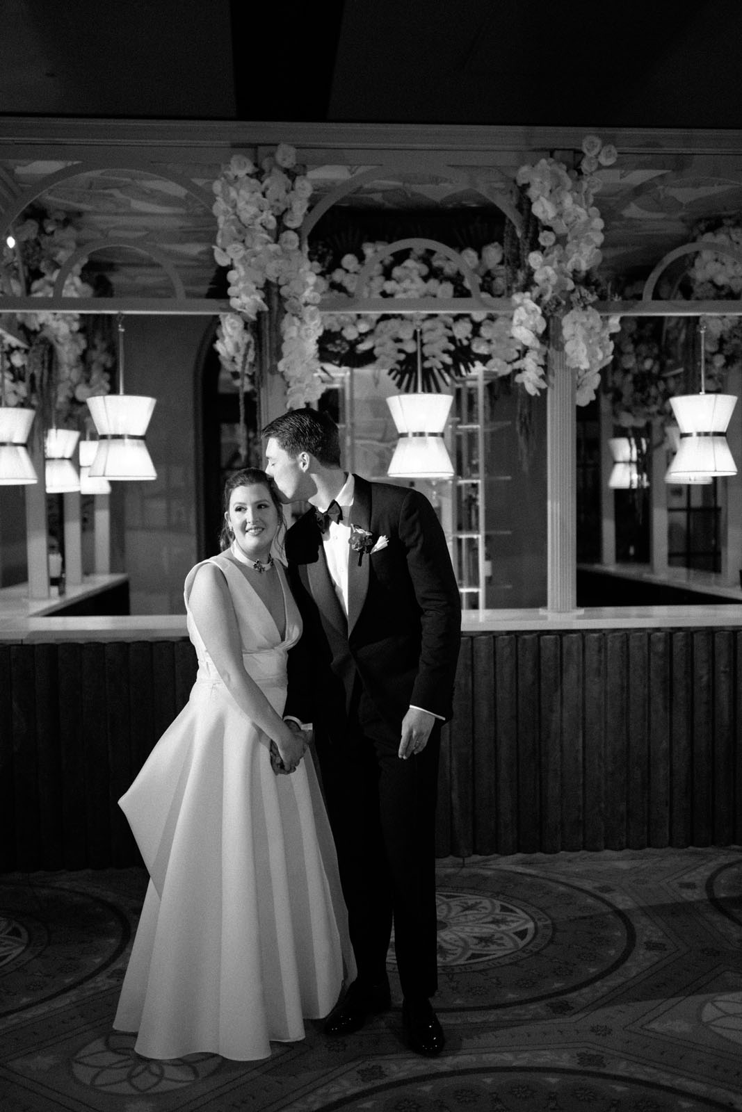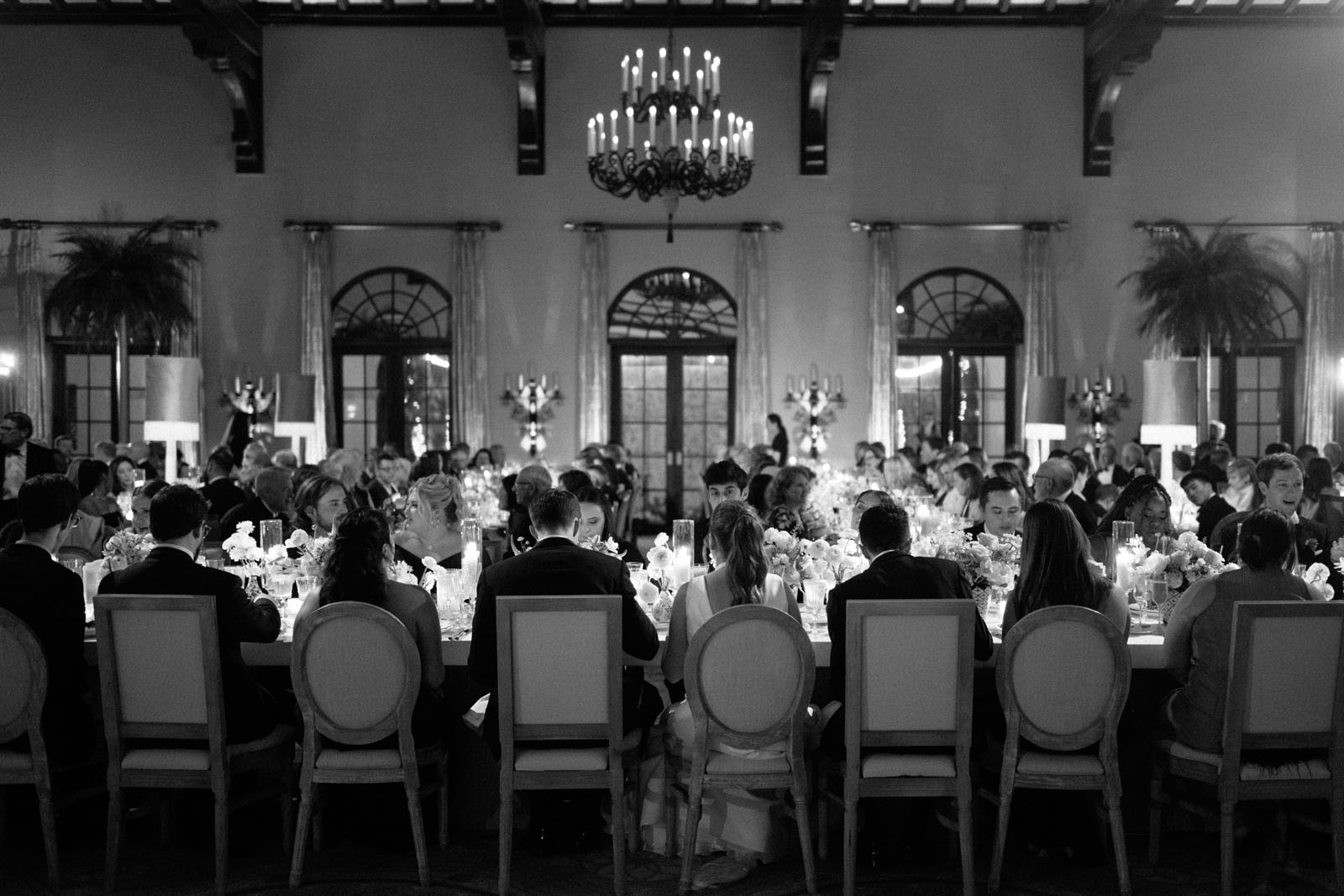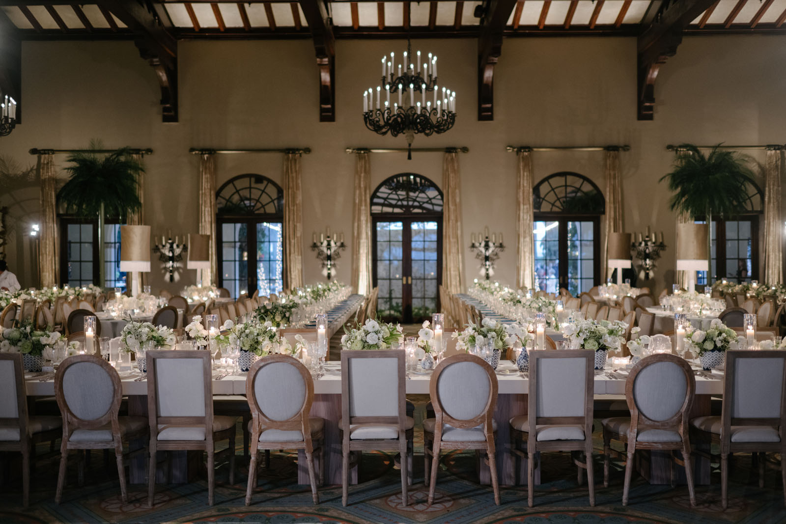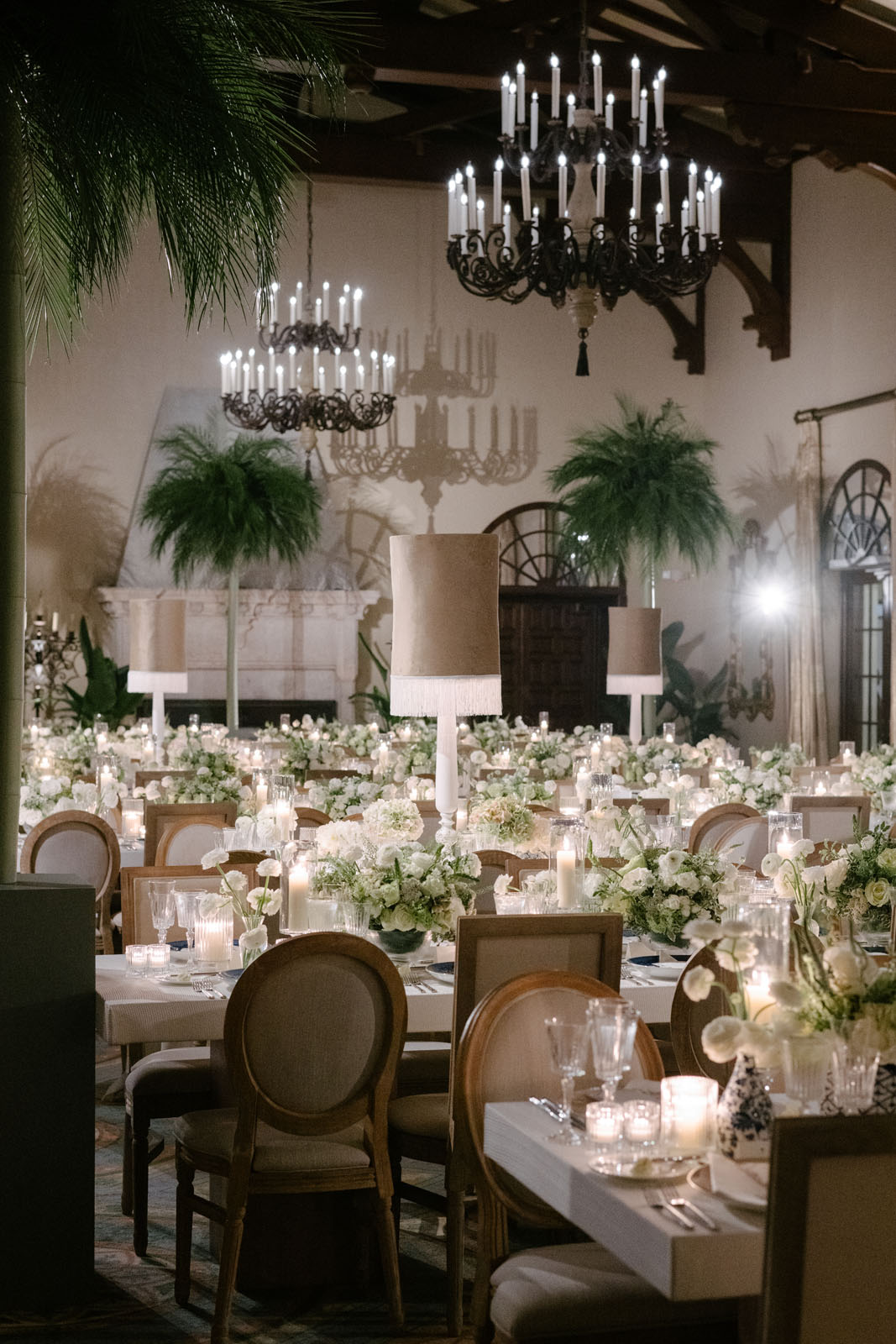 Inside the ballroom, the space was curated with only royal tables, elegantly accented with palms and muted but oversized fringe lamps, setting the stage for an understated yet luxurious dinner experience. The bespoke details of this love story were boundless, yet executed with such subtlety that their full artistry was visible only to the most discerning eye.