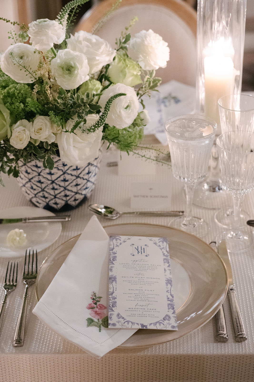 Our graphic design team created a custom illustrated pattern for the invitation liner, and we sourced the perfect vintage china cabinet, transforming it into a unique, memorable seating chart, styled with one-of-a-kind vases and the bride’s favorite flowers.